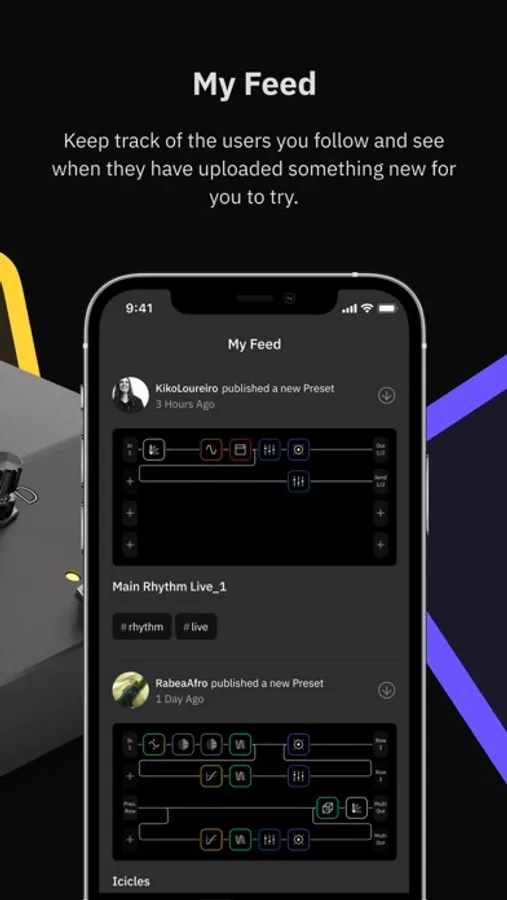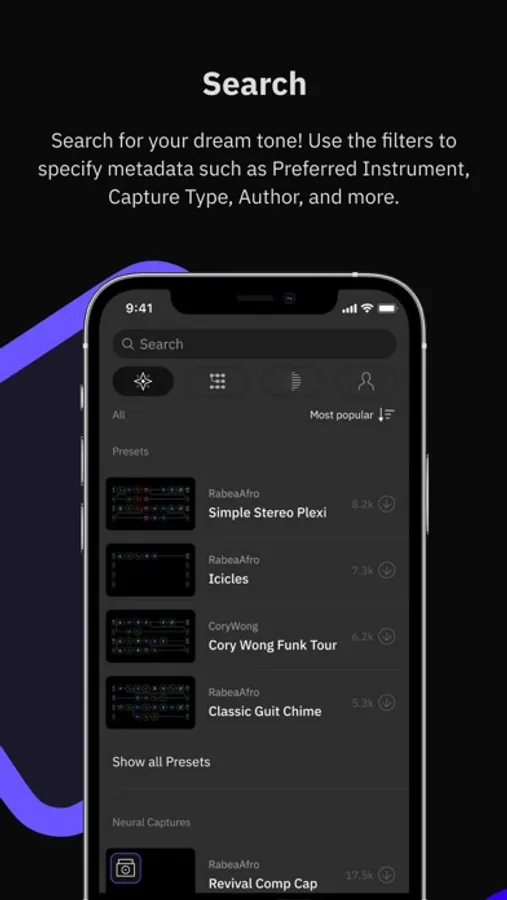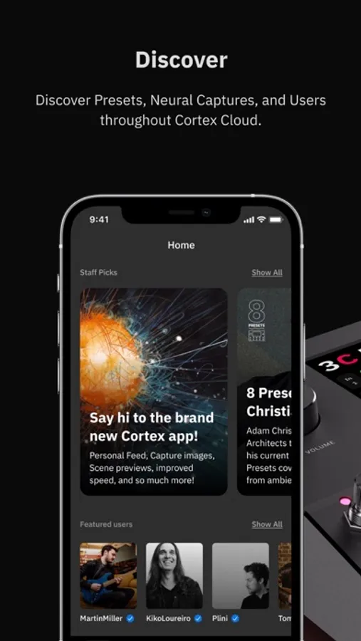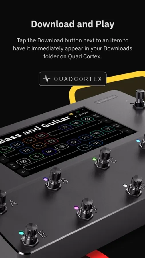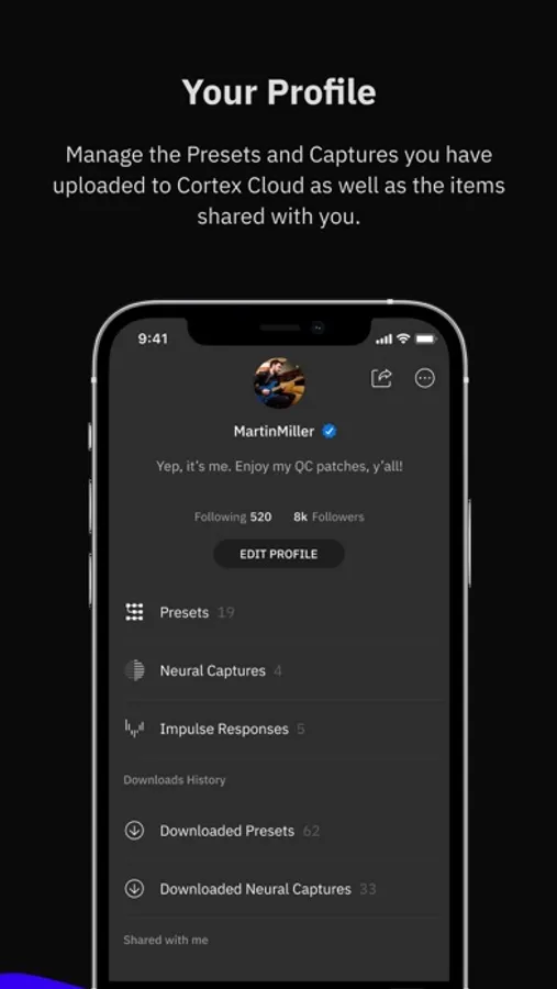 Cortex Mobile allows you to access Cortex Cloud through an intuitive and elegant interface. Browse users, Presets, Neural Captures, and more. Download items to have them display instantly on your Quad Cortex. You can also manage your profile, as well as change the privacy settings for any of the files you have uploaded to Cortex Cloud.