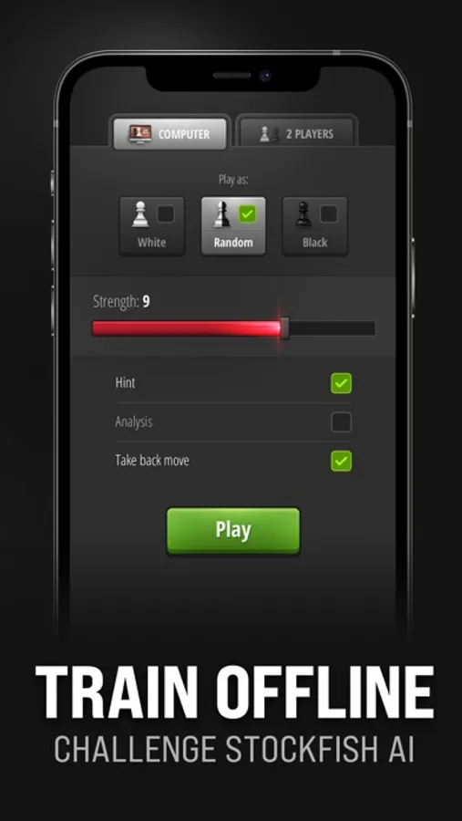 - Play against the famous Stockfish engine with 10 difficulties in offline mode.