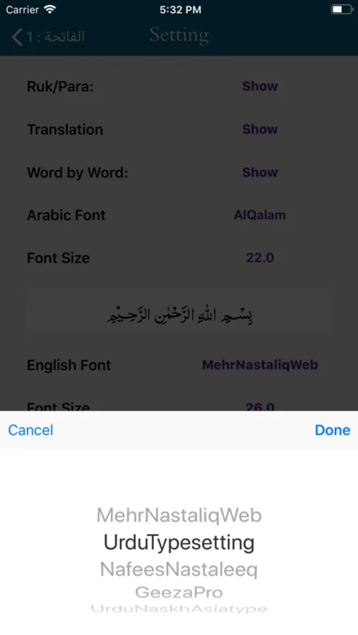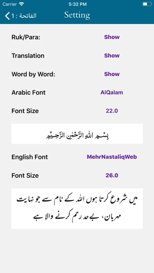 - Ability to show/hide Word by Word, Quran Translation (Tarjuma)