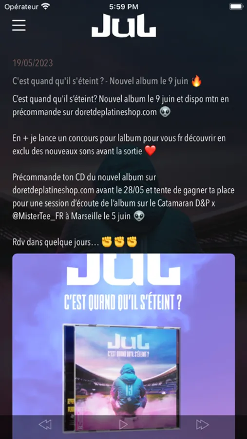 Découvrez l’application gratuite du rappeur Marseillais JUL et retrouvez-y toute son actualité en plus de contenus exclusifs (Julmoji, photos exclusives…).