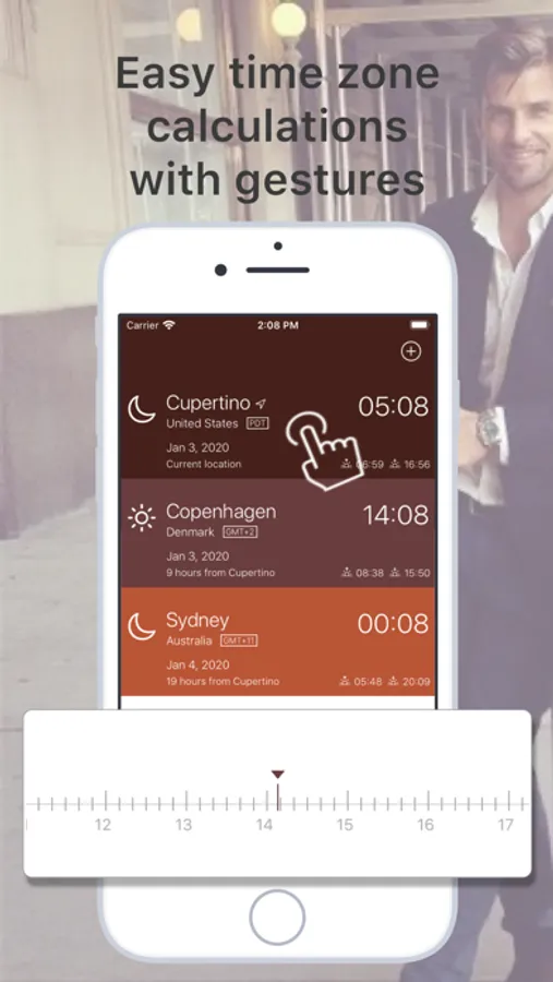 - Easy time calculation across time zones using simple gestures.