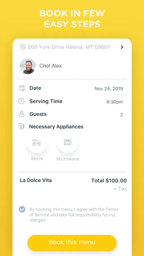 The app allows you to book a dining experience prepared by a chef, right in the comfort of your home.