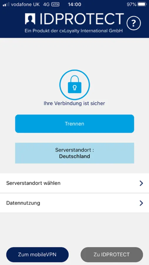 IDPROTECT mobileVPN stellt in Sekunden eine Verbindung mit erhöhter Sicherheit her und läuft unsichtbar im Hintergrund, während Sie mit unbegrenztem Datenvolumen im Internet surfen oder anderen Online-Aktivitäten nachgehen. Jedes Mal, wenn Sie eine Verbindung zum Internet herstellen, wird geprüft, ob das Netzwerk sicher ist. Wenn das Netzwerk nicht sicher ist, aktiviert sich IDPROTECT mobileVPN automatisch und verschlüsselt Ihre Verbindung.