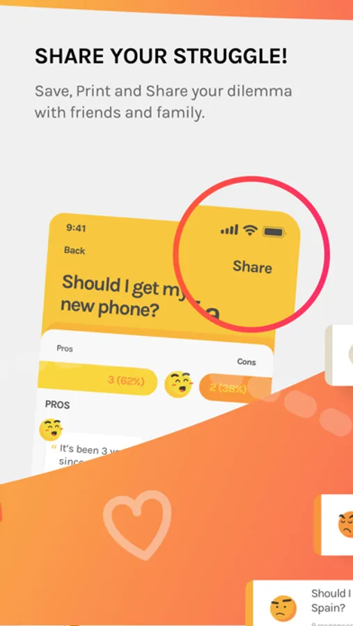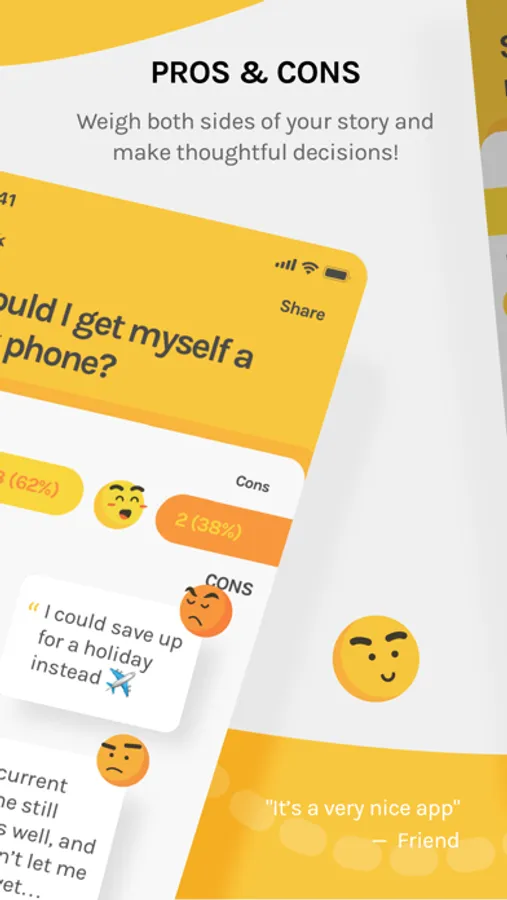"Help me decide!" Maybe you'd like to share your question, or help a friend make up their own decision. We make it easy to export and share your questions, and final results with a single tap!