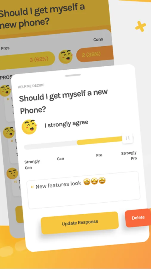 "This versus that?" When it comes to tough decisions, the only thing you could be certain about is how you feel vs the choices. Therefore, it's only logical to weigh pros and cons this way too! Let our little smiley meter help you express how positive and negative your points are!