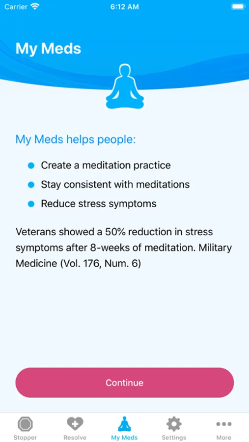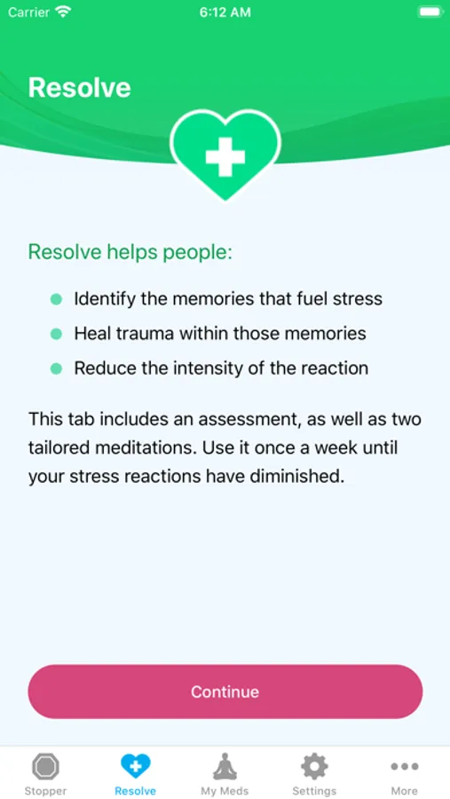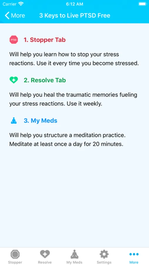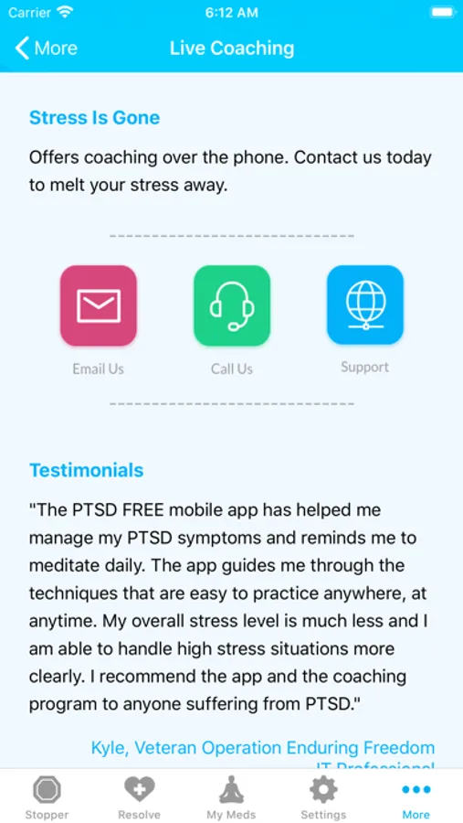 The key to managing PTSD more effectively is using this app as directed. Every time you become stressed, press the app icon and breathe. Every time a Stress Stopper reminder shows up on your device, breathe along with the animation. When it’s time to meditate, give yourself the 5, 10, or 15 minutes of relaxation that will improve your life. And finally, get to the root of the issue; use the Resolve Tab to help process those past memories that affect everyday life. All these tools together will prolong your life and help prevent future stress-related health problems such as cancer, panic attacks, anxiety, depression, cardiovascular and gastrointestinal diseases, migraines, sleep problems, chronic fatigue, ulcers, etc.