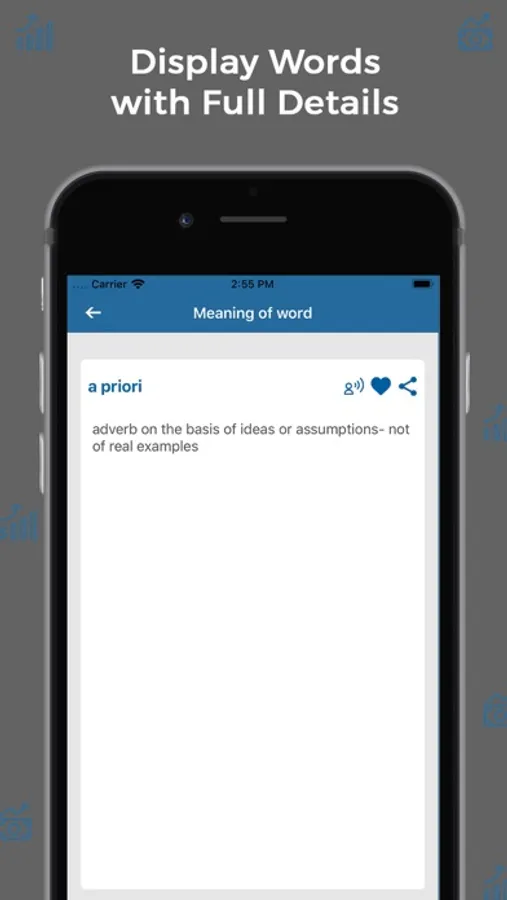 - Want to save a word meaning in the favourites? Tap the heart button and we will add this word automatically in your favourites. You can easily access to it anytime within the favourites choice in the options menu.