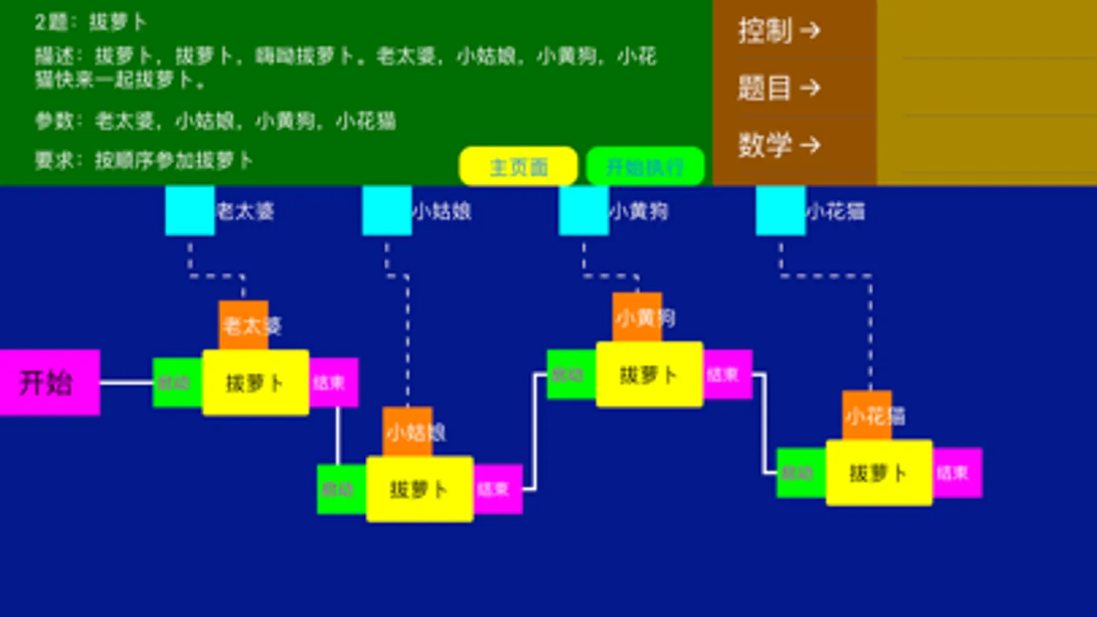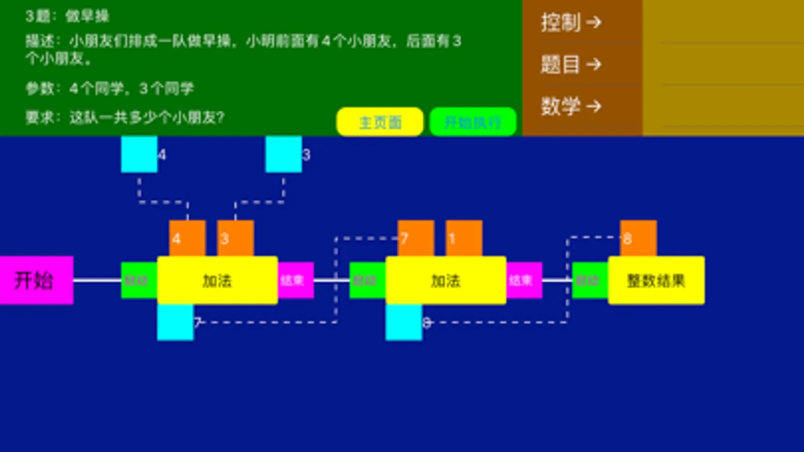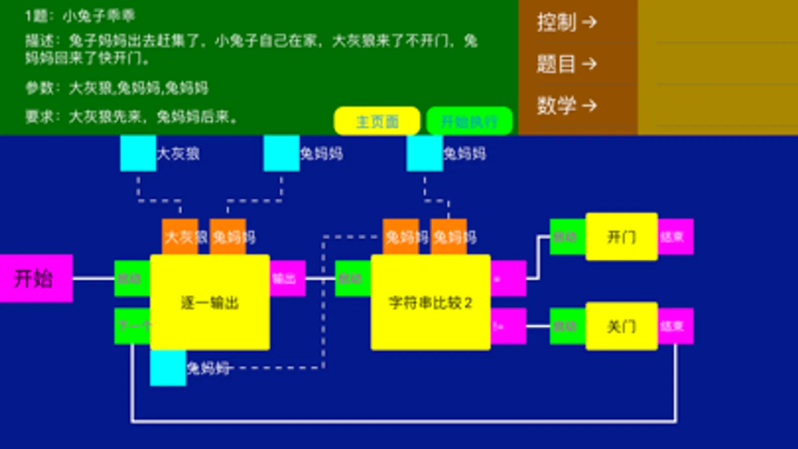 50 classic interesting mathematical problems, from the beginning to mastery, combined with classic interesting application problems, provide word judgment, addition, subtraction, multiplication, division, remainder, average, array, sorting and other aspects. The user only needs to use the topic parameters provided, carry out program operation by connecting multiple execution blocks, and finally verify the operation results without the user's own programming materials.