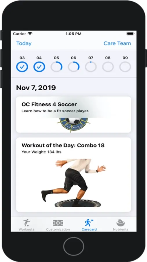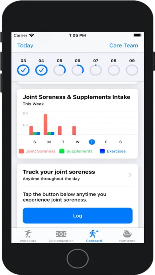 In this app, we integrate with the health app (Carekit) to help you record and keep track of your recovery data (such as joint soreness, supplement intake, and exercises) easily.
