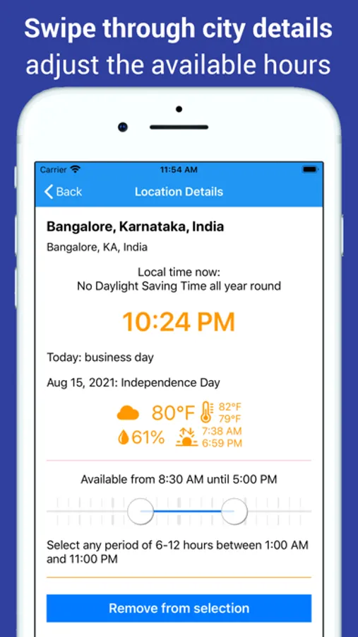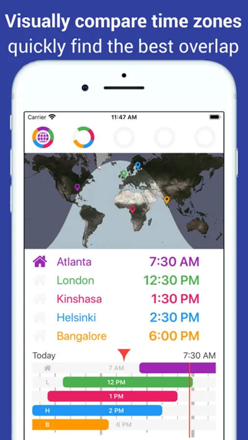 • Instantly see which hours overlap between your location and up to four places elsewhere on the world.