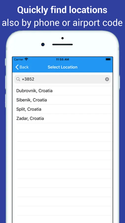 • Quickly select from over 10,000 locations: via city, province or country name, airport code (LAX, BCN, DXB etc.) or the first digits of the international phone number.