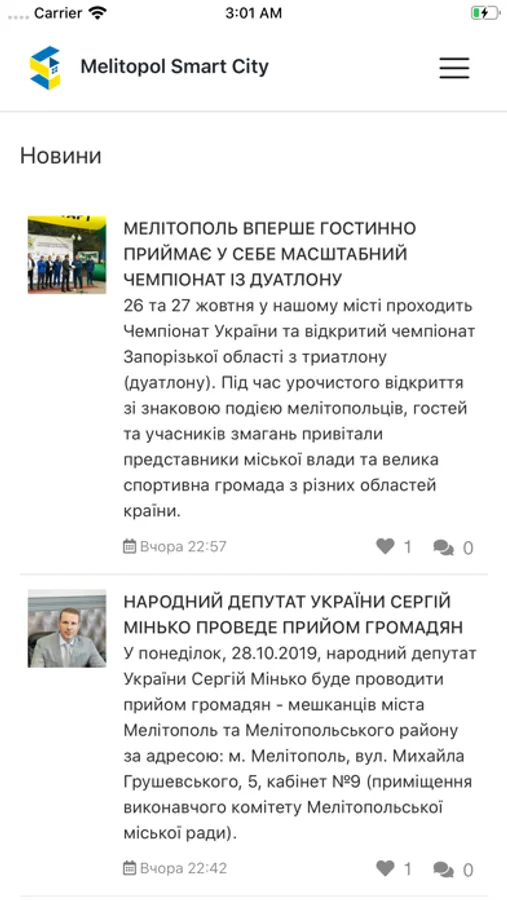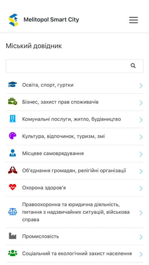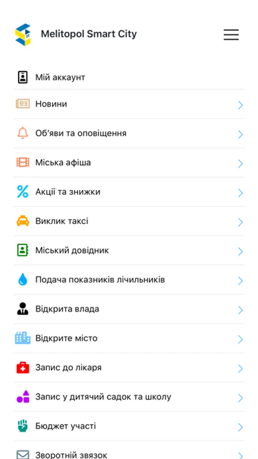 Міський мобільний додаток для городян та гостей міста. Додаток інформує користувачів про актуальні новини, вміщує афіши та анонси заходів, об’яви та оповіщення. Додаток має наступний функціонал: міський довідник, запис на прийом до спеціалістів виконавчого комітету Мелітопольської міської ради та до лікаря, запис дитини у дитячий садок та школу, подача запитів до органів місцевого самоврядування, подача показників лічильників води, електроенергії та газу, перегляд результатів голосування та виконання Бюджету участі. Городяни можуть повідомити про проблеми мікрорайону, двору, будинку через сервіс Відкрите місто. Додаток інформує про акції та знижки у місцевих та мережевих торгівельних точках. Сервіс дозволяє викликати таксі.