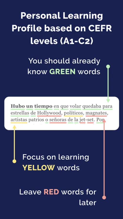 The scale used for the Personal Learning Profile is the CEFR (Common European Framework of Reference for Languages) and its levels A1, A2, B1, B2, C1 and C2. Example: If you state level A2, Lingoal assumes that you want to learn all the words associated with this level (YELLOW). The app also assumes that you know all the words on all levels below the chosen (A1, GREEN). It also assumes that you still don't know any words on the levels above (B1-C2, RED). Naturally this is an approximation. You can always change the state of a word to other colors and it will show up correctly in any other media you are using in Lingoal.