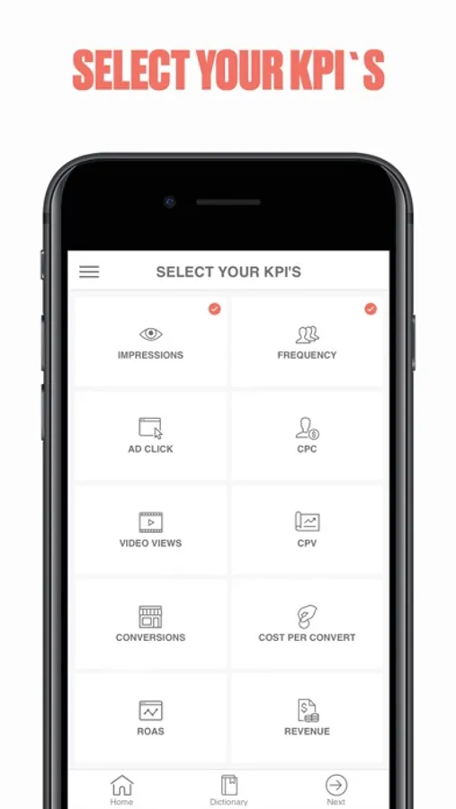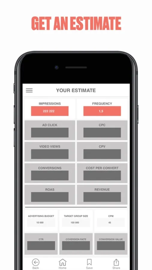 Select up to ten KPI`s, fill in your numbers such as advertising budget and CPM, get an estimate, choose if you want to save the estimate in your personal library or share it with a colleague, client or your agency via e-mail, messenger or sms.
