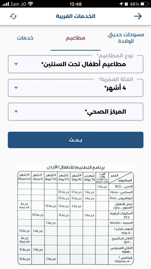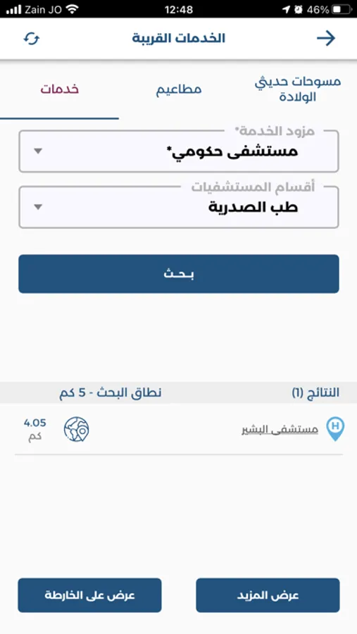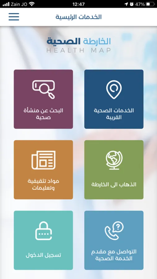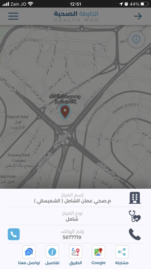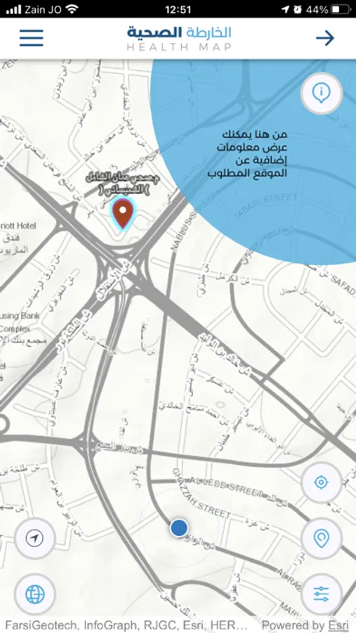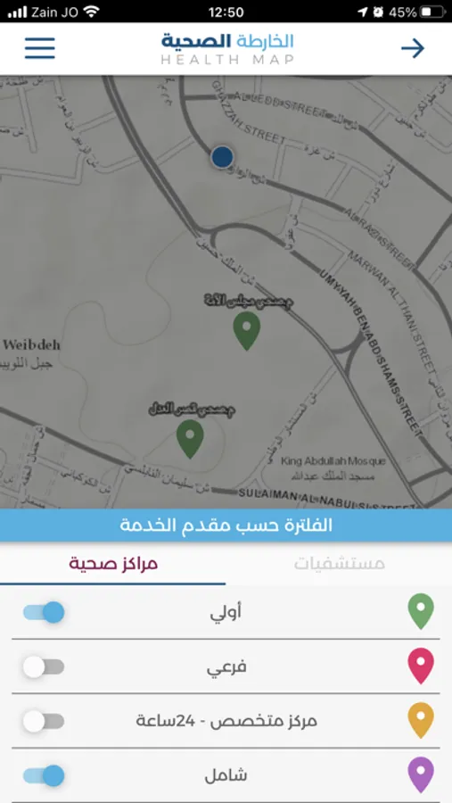 عزيزنا المستخدم، يقدم لك تطبيق وزارة الصحة الأردنية للهواتف الذكية إمكانية الوصول إلى الخدمات الصحية المختلفة الموزعة في جميع محافظات المملكة بسهولة من خلال عرض مواقعها على خريطة تفاعلية وتحديد قربها من موقعك الحالي، ويتوفر هذا التطبيق باللغتين العربية والانجليزية. يوفر التطبيق أيضا إمكانية البحث عن مركز صحي أو مستشفى من خلال ادخال الاسم أو جزء من الاسم، حيث يتم عرض جميع النتائج المطابقة لمعايير البحث وترتيبها حسب قربها من موقعك ، وعند الضغط على أي من هذه النتائج يتم عرض الموقع على الخارطة مباشرة مع مجموعة من الخيارات المختلفة.