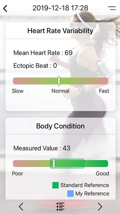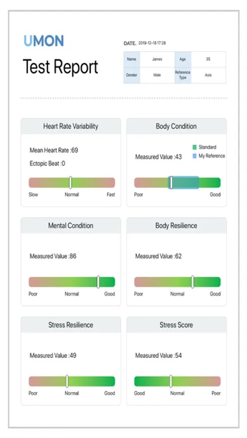 1 minute measurement provides heart rate, endurance, body condition, recommended training intensity, body recovery, and mental condition.