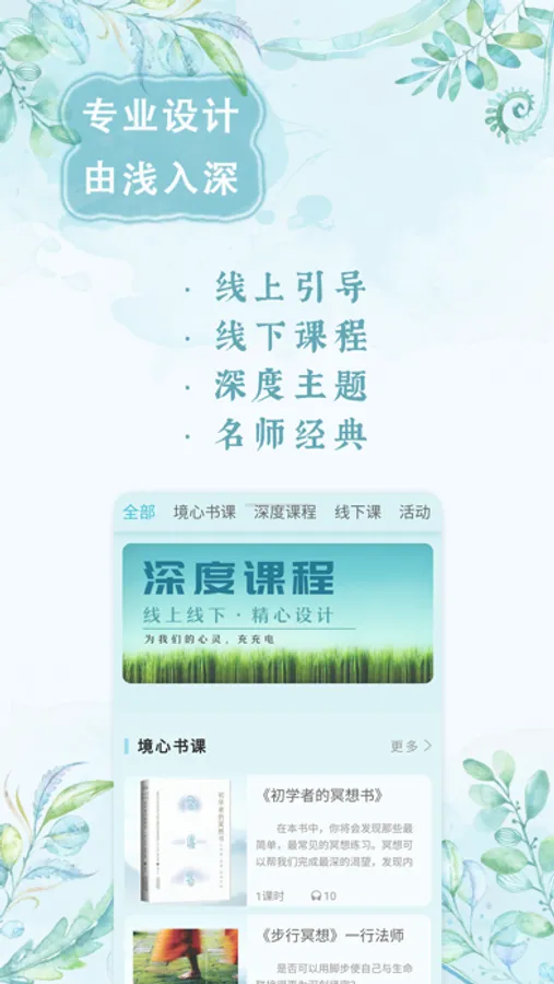 同时还有从入门到精深的静心冥想线下课程,以及带给我们身心宁静与安宁的心灵音乐会、心灵读书会等丰富多样的线下活动及交流。