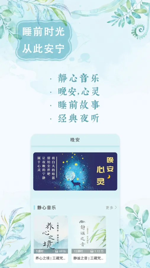 包含数十个针对场景及细分的主题冥想引导,由业界资深专家精心打磨,每一项课程,每一节内容,每一段词句都极尽专业与尽责,务求“专业精品、入耳入心”,为您的身心带来清净引领与安宁陪伴。