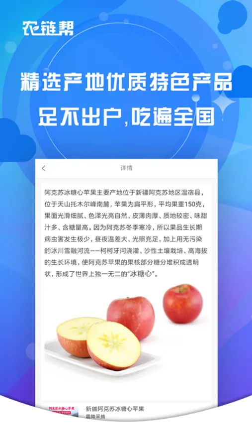 “农链帮”是立足于“兴牛网”、“畜牧帮”、“疆之农”等农牧业产业链前端平台打造的一个面向消费者市场的特色农牧产品垂直电商平台。依托于产业产业链前端平台在原产地获取到的优质产品资源、精准的溯源信息、有竞争力的采购价格,通过与供应商的深度合作,打通从产地到消费者之间的中间流程,省却多余成本,将更优质的农牧产品用更低廉的价格送到消费者手中。愿景是高效地整合优质农牧产品资源,为市场提供更优的解决方案。