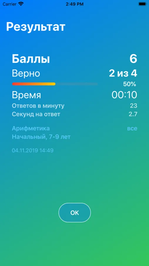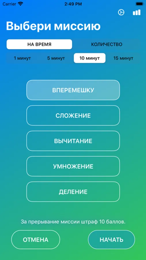Сложность примеров для решения зависит от возраста и настраиваемой сложности. Можно выбрать тренировку на время или по количеству примеров.