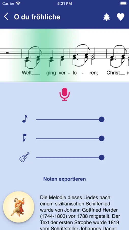 Beim Abspielen der Lieder läuft am Smartphone oder Tablet das Notenbild mit dem Text mit, um so das Erlernen des Liedes zu erleichtern. Zunächst sollte man in der App nur jene der beiden Gesangsstimmen laut lassen, die man lernen möchte. Mit dem Lautstärken-Regler kann man die andere Stimme ganz einfach leiser oder wegschalten.