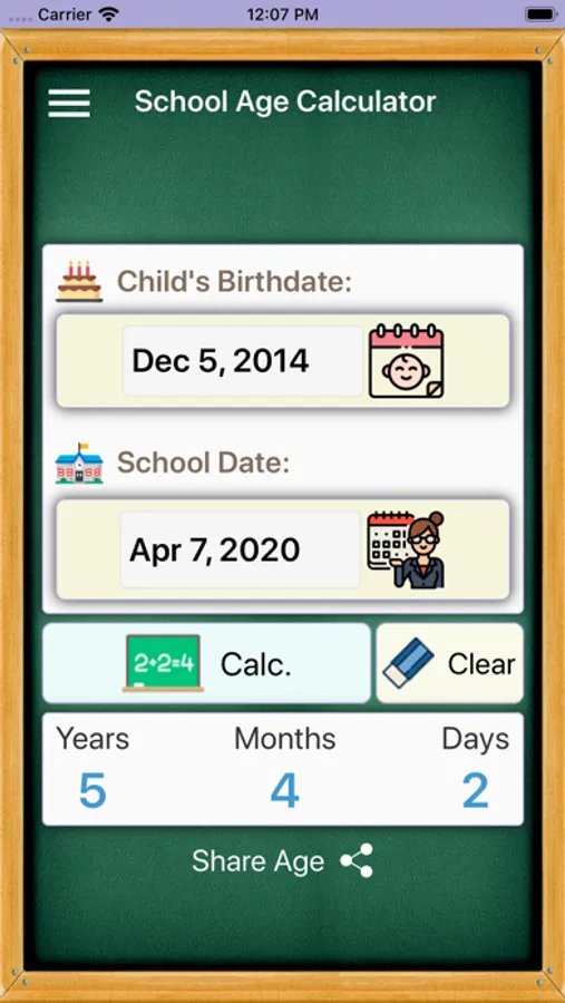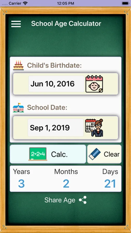"School Age Calculator" is a useful app to answer the common question in every school application form for admission "What is your child's age on school start date in (Years, Months, Days) ?".