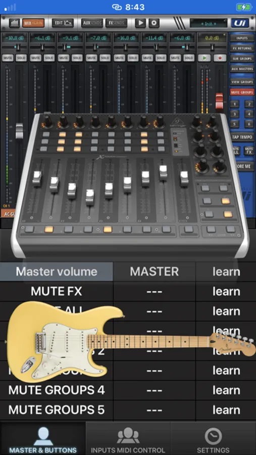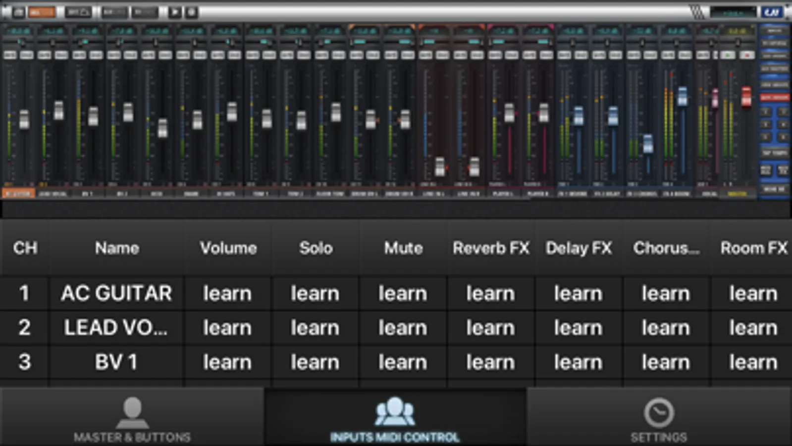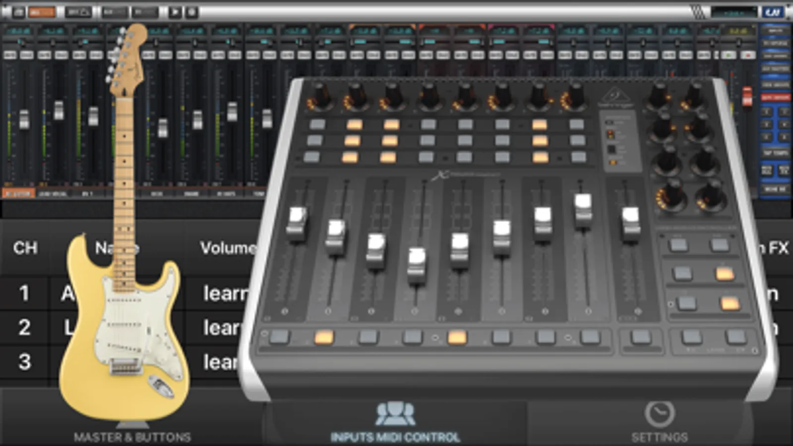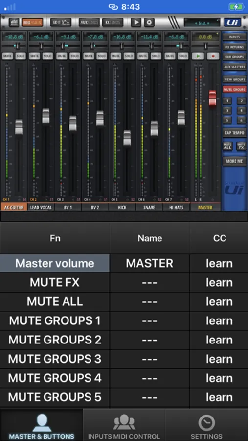 With Soundcraft® Ui MIDI mixer app you can comfortably assign "virtual" faders from your Ui mixer to the hardware MIDI controller using built-in "learn" function. You can now control all MICS, LINE inputs, SUBS, DRUMS or GUITAR volume (reverb, chorus, delay ...) using your hardware MIDI equipment like MIDI keyboards (with faders or knobs) or MIDI pedal etc. without touching the display!