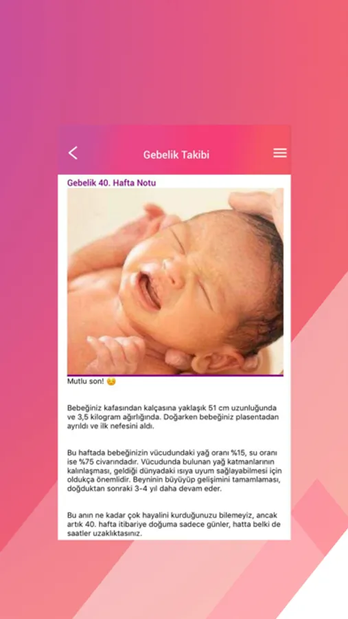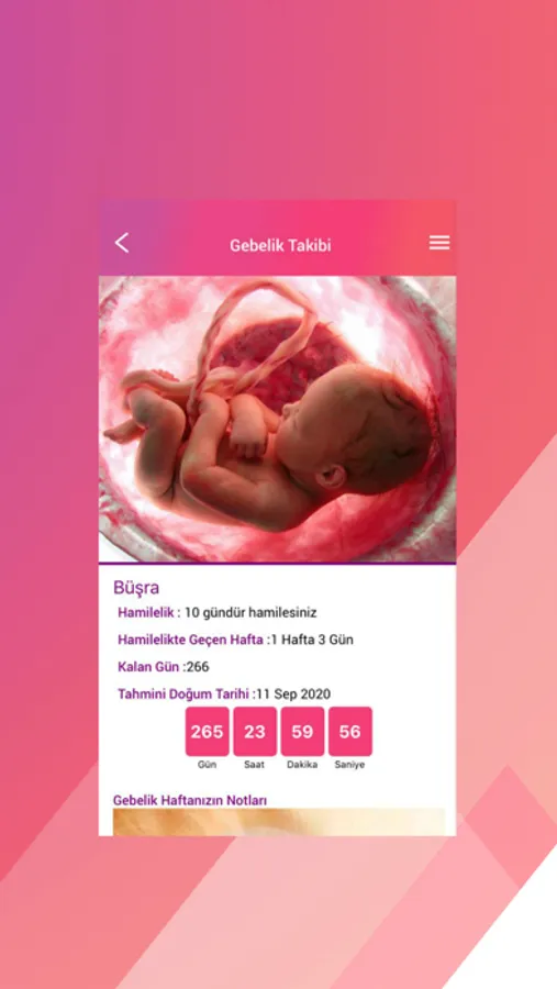 Gebelik takvimi sadece kategorisini gebe seçenlere özel bir seçenek. Gebe takvimi olarak kullanabileceğin bu alanda girdiğin son adet tarihini baz alarak gebelik haftanı hesaplıyor, bebeğinin haftası ile uyumlu ölçümleri hakkında sana ipuçları veriyor ve seni nelerin beklediğini sana önceden söylüyor. A tabi bir de doğuma kaç gün kaldı sorusunun cevabı da hep hazır.