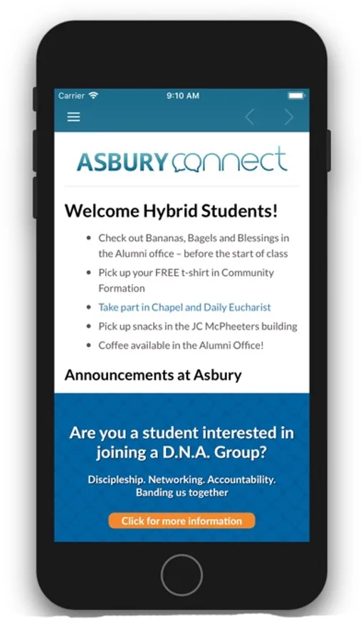 Asbury Connect is the official app for Asbury Theological Seminary. It’s a must-have for students studying in residence or online. With easy access to formation opportunities, community and local happenings, campus maps, lodging and dining facilities, and more, Asbury Connect has everything you need when you’re on campus!