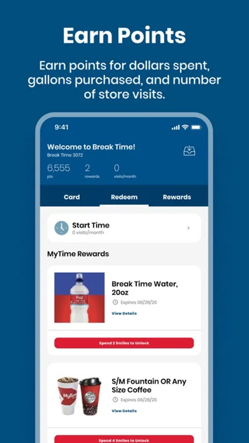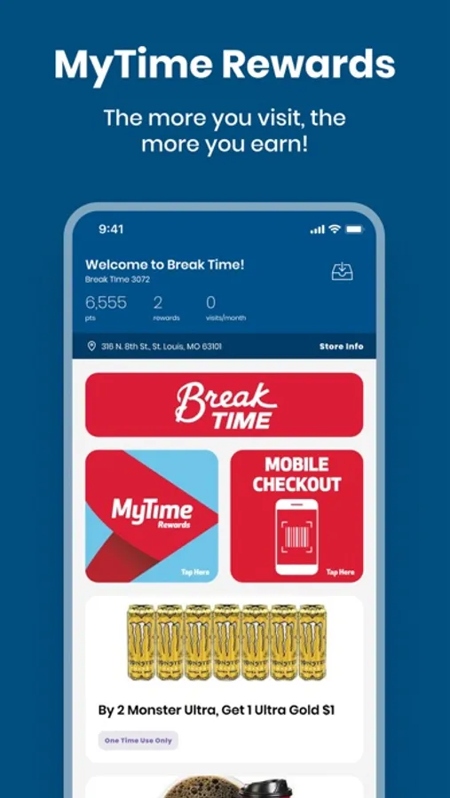The Break Time app is a “must have” for customers of Break Time convenience stores in Missouri. Get great deals on snacks and beverages with app coupons! Manage your MyTime Rewards account and redeem points for even more discounts and free stuff from our loyalty program. Tap into Mobile Checkout and save time by checking out and paying with your phone. No more lines!