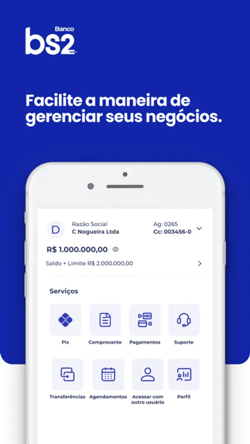 O BS2 atua há mais de 26 anos no mercado, antes como Banco Bonsucesso, uma instituição financeira sólida e bem-sucedida. Então, aqui você pode confiar, pois o eu dinheiro está em boas mãos. Baixe o APP do BS2 Empresas e faça gestão da sua conta empresarial!