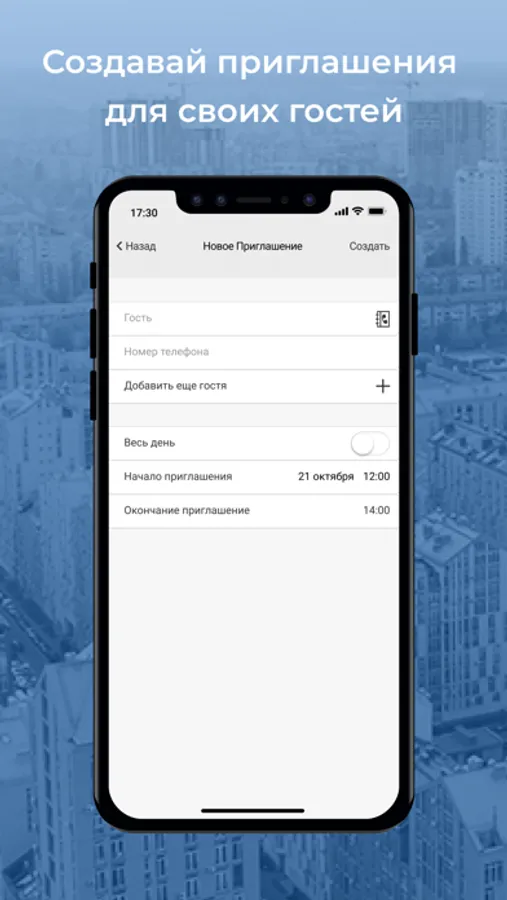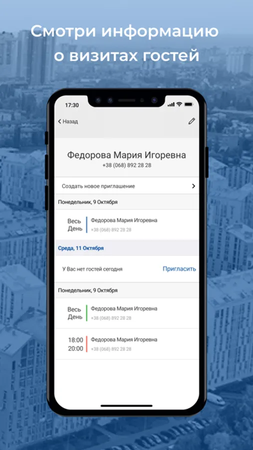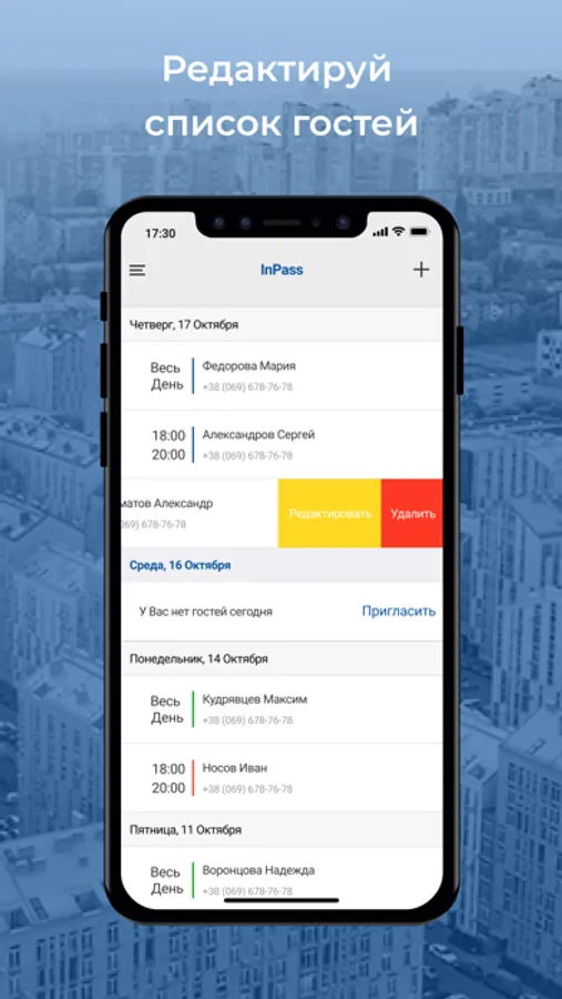 Не нужно звонить охране, заходить на сайт или делать другие сложные действия. Просто зайди в приложение InPass и выбери того, кого нужно пропустить. Если гость навещает не в первый раз, просто активируй пропуск повторно. Это займет не более 15 секунд взаимодействия с твоим смартфоном.