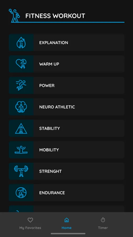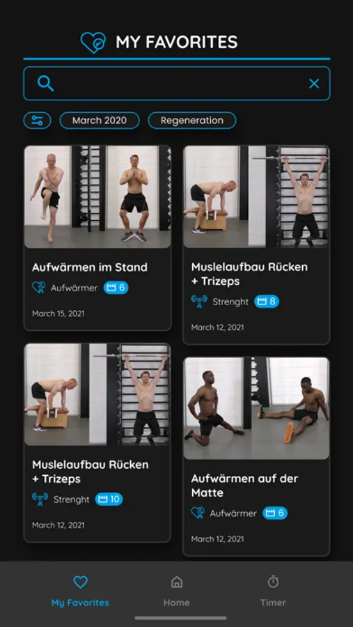 A Workout is one session. On the workout list you will find all fitness workouts by category. The list shows the important details of every workout. Main focus, Level, Tools and Duration. Easily you find the best workout for you.