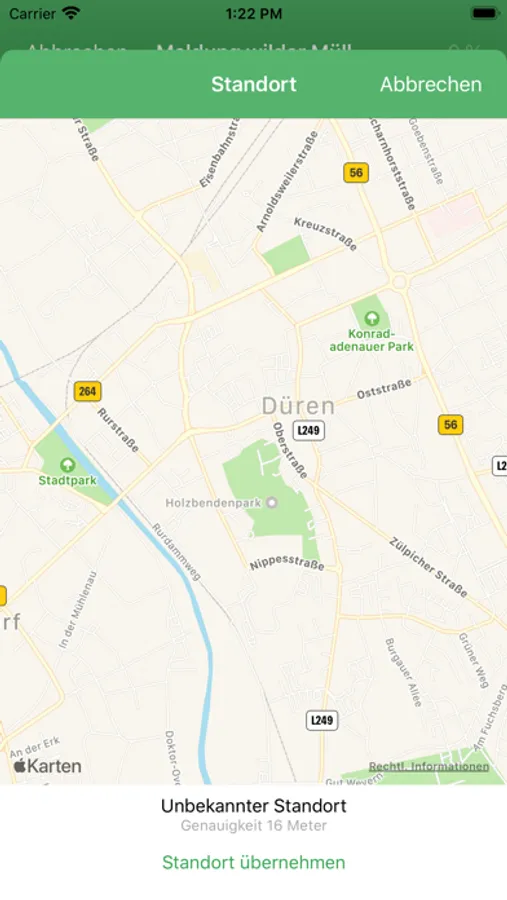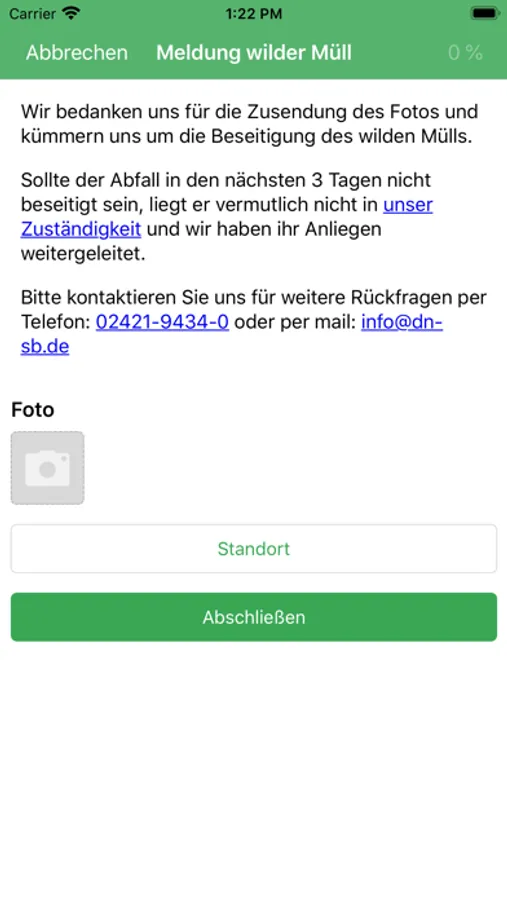 Dazu muss ein Foto von der Anfallstelle bzw. dem Fundort aufgenommen werden. Das Foto wird über die App mit dem Standort verknüpft und an den Dürener Service Betrieb gesendet.