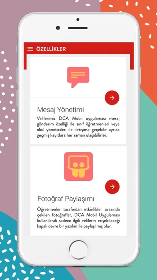 Velilerimiz DCA Mobil uygulaması ile sınıf öğretmenleri veya okul yöneticileri ile iletişime geçebilir, Öğretmenler tarafından etkinlikler sırasında çekilen fotoğrafları takip edebilir, yoklama durumu, ders programları, yemek programları, bültenler ve gelişim raporlarının tamamına elektronik ortamda mobil uygulamamız ile ulaşabilirler.