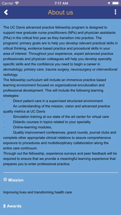 This educational mobile application has been developed to support advanced practice fellowship providers as they transition to clinical practice over the first year. Key information that simplifies learning organization culture and their new specialty has been included. A planned curriculum aimed at accelerating clinical skill is organized in a mobile platform for ease of use.