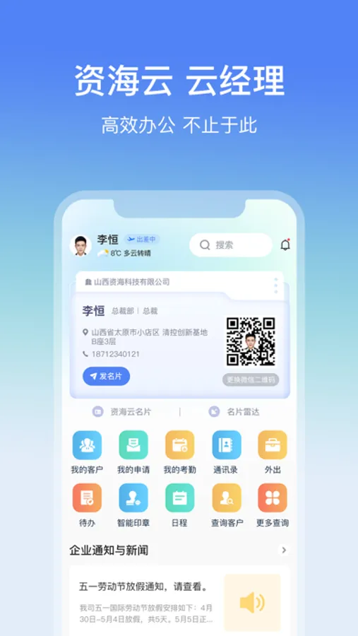 云经理APP旨在为企业提供全域全场景高效智慧协同办公系统,打破传统的功能划分,按需求提供相应服务,通过按照登录角色权限设置,云名片、工作台、积分商城等功能简易便捷操作更省时省力。