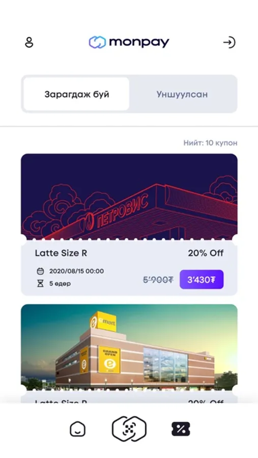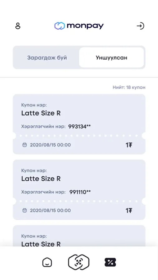 • КУПОН ШАЛГАХ - Монпэй апликейшнаас худалдан авсан хэрэглэгчийн купоныг уншуулж баталгаажуулна.