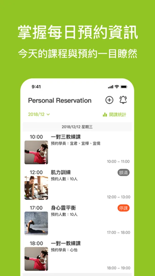 - 整併團體課及私人課,排課狀態完整明瞭。