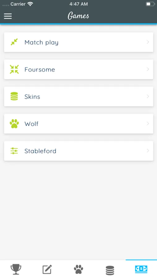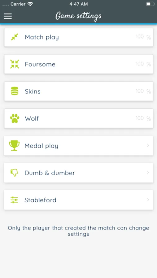 Classic Golf Games by Bad Boyz Golf is an app that gives results for stroke play, Match Play, Foursome, Skins, Wolf, Stableford and Dumb and Dumber, simply by inputting the score in each hole, you can choose to play with handicap and change the handicap percentage you want to use.