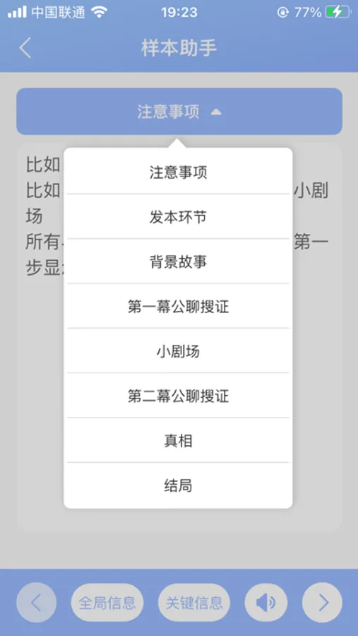 开本助手APP的主要功能是把剧本杀的主持人手册拆解为多个流程,每个流程提醒主持人当前的注意事项。