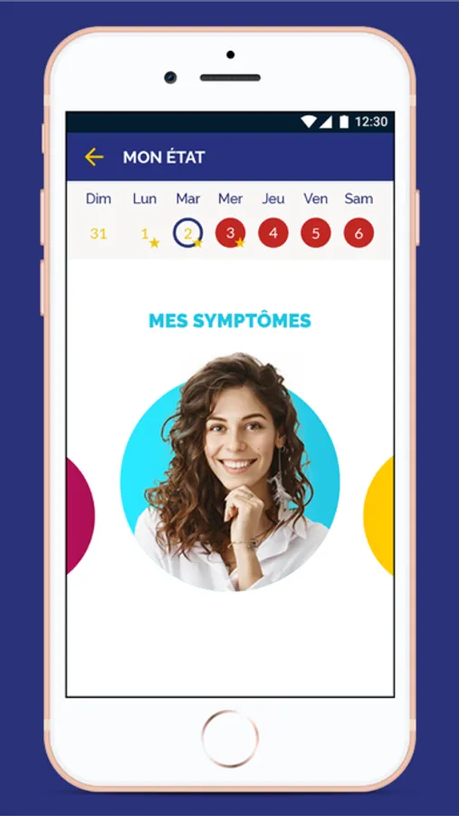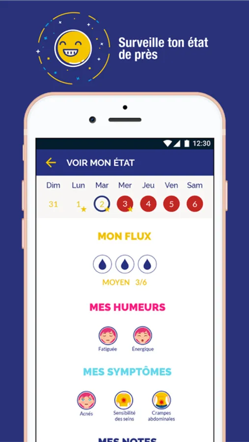 - Visualisation des événements et manifestations de votre cycle que vous pouvez enregistrer et partager avec votre médecin.