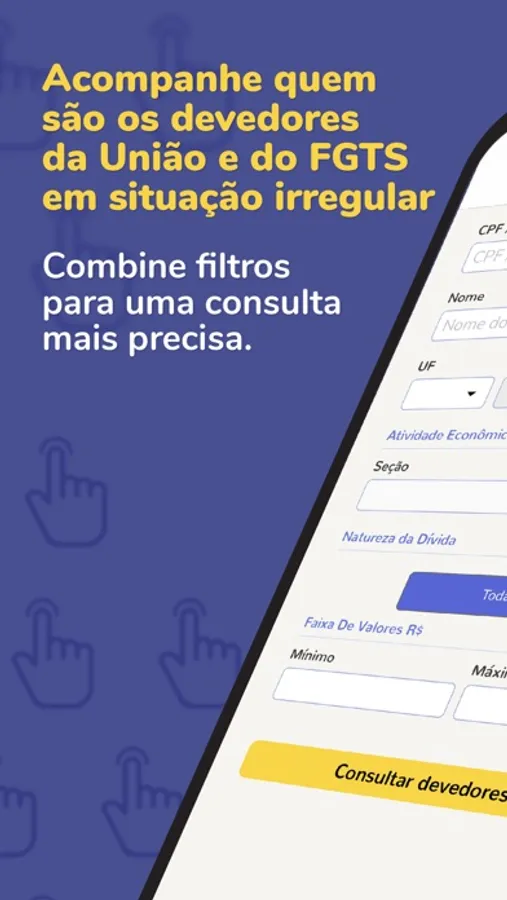 3. Consultas personalizadas por tipo de dívida (FGTS, multa trabalhista, multa criminal, multa eleitoral, previdenciária, demais débitos tributários, demais débitos não tributários), Estado, Município, atividade econômica e faixa de valor da dívida;