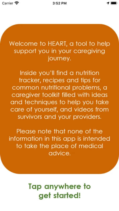 HEART is a tool to help support you in your caregiving journey. Inside you’ll find a nutrition tracker, recipes and tips for common nutritional problems, a caregiver toolkit filled with ideas and techniques to help you take care of yourself, and videos from survivors and your providers. Please note that none of the information in this app is intended to take the place of medical advice. HEART was developed with support from the National Cancer Institute