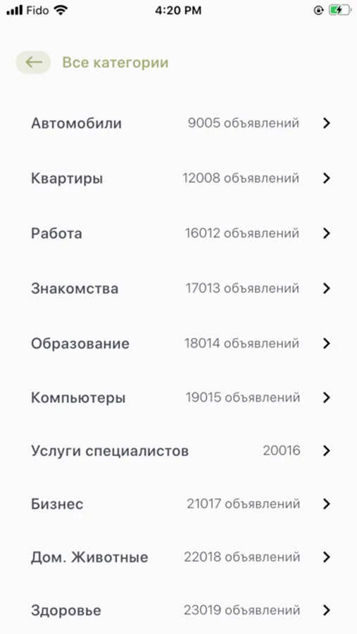 Каталог объявлений включает следующие разделы: Недвижимость; Работа; Автомобили; Услуги специалистов; Образование; Домашние животные; Бизнес; Дети; Перевозки; Отдых; Работа; Разное.
