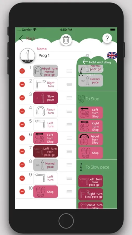 If you rather put together programs of your own, you can store up to six different programs. Drag and drop from a list containing the commands (in English, German, Norwegian, Danish or Swedish). This list differs slightly depending on what steward/languange is currently chosen. You can name your program and change the icon.