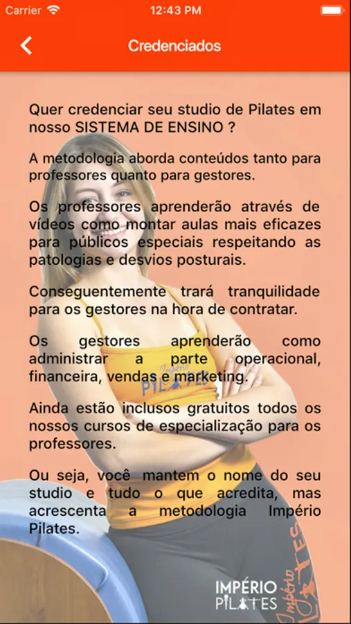 Alunos e professores da Império Pilates agora tem acesso pelo app para marcar suas faltas e reposições, alterar horário de sua aula, ver sua evolução através de fotos e indicar nossas unidades para amigos e familiares. Além de obter descontos e vantagens exclusivos com nossos parceiros.