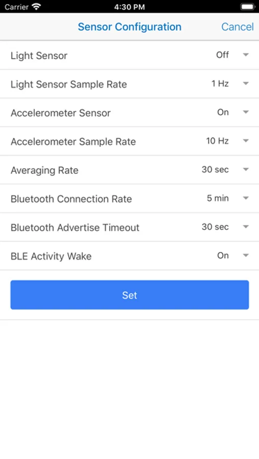The mSMART DeLux Sensor App collects participant light exposure and activity from IAI’s DeLux sensor packages for healthcare research program. Data is collected via BLE from IAI’s mSMART DeLux sensor app and stored on the mSMART research platform. Device data for a defined date range is exported via CSV file for analysis. Measurement and average rates are independently configurable for both light and activity. The sensors can be configured to periodically connect to the app to upload data, or configured to connect on a double tap of the device.