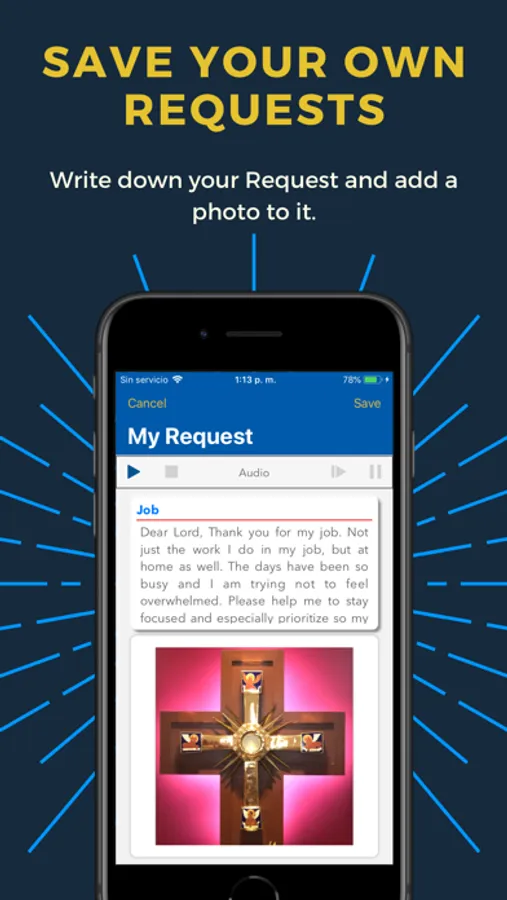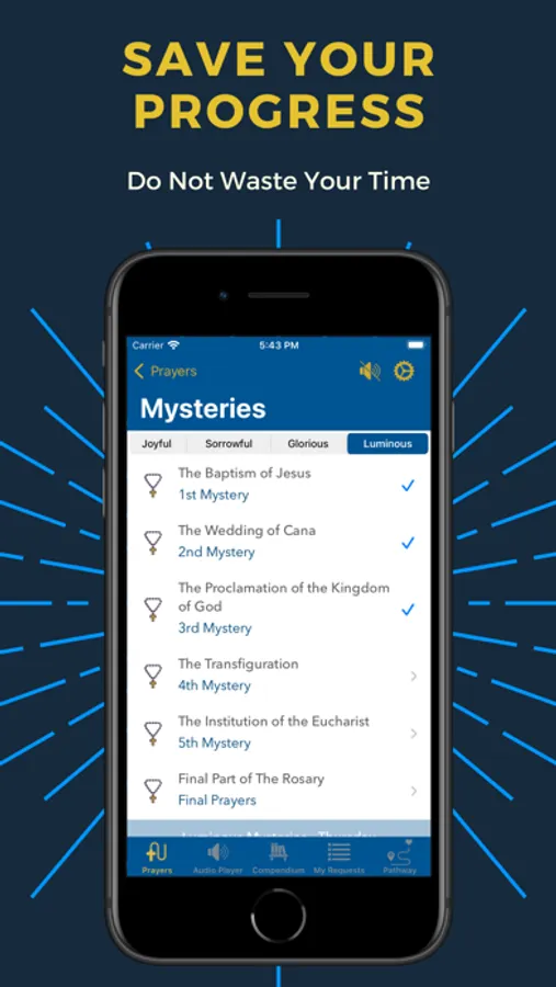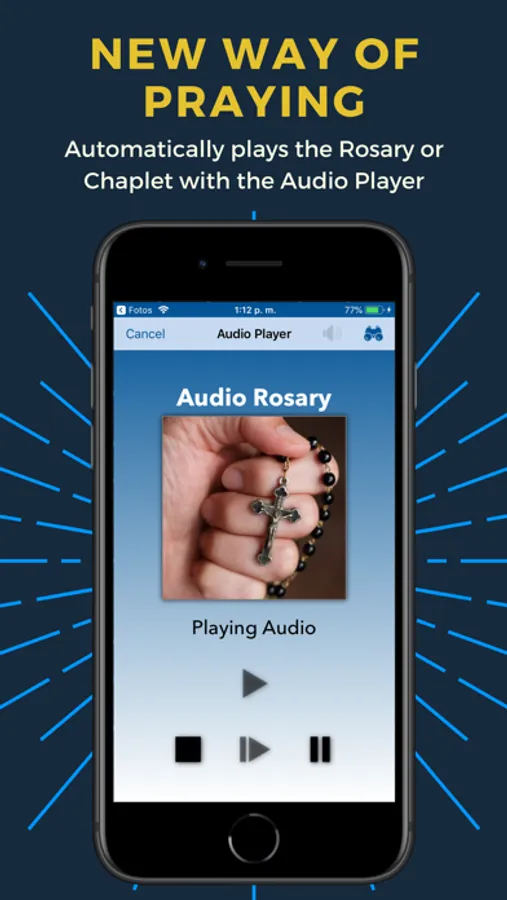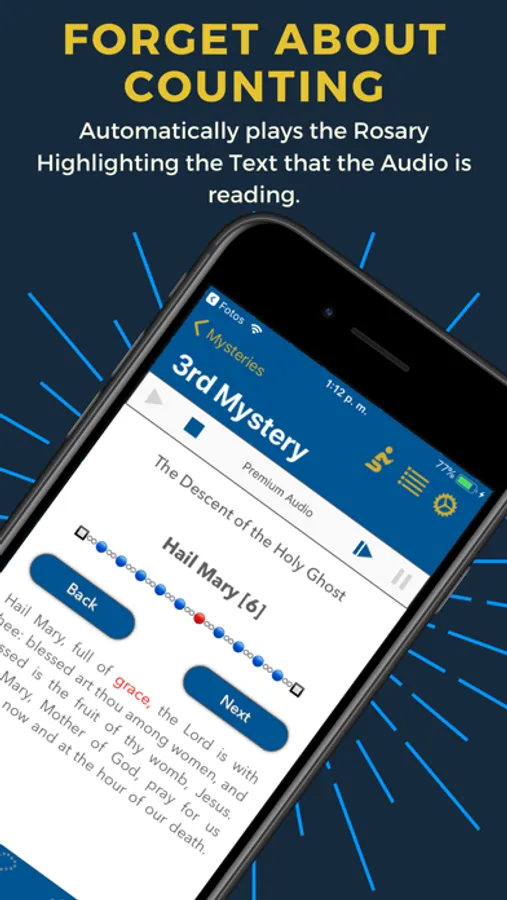 + The Audio Rosary automatically plays the Mysteries that correspond to that day.