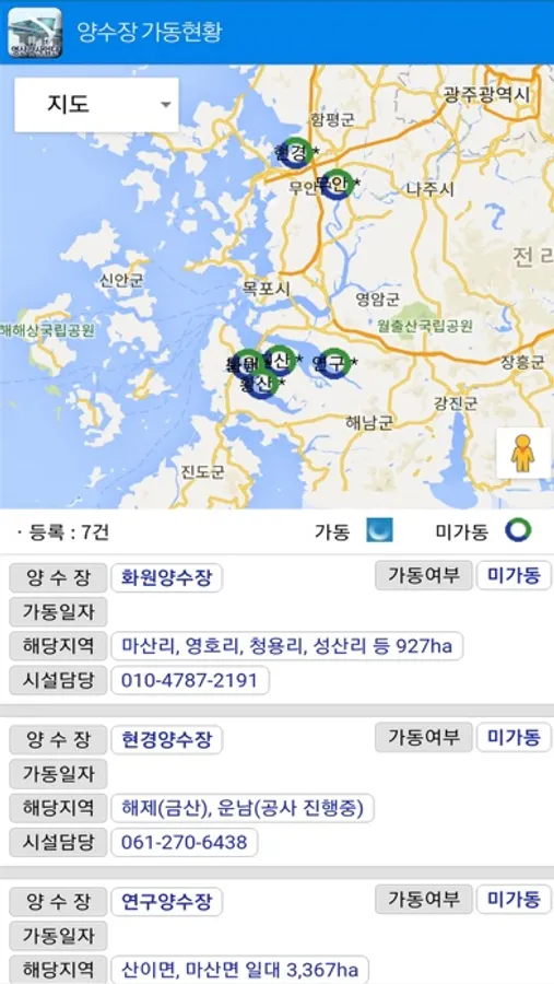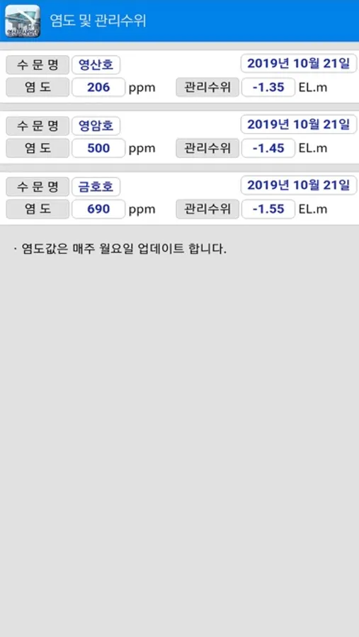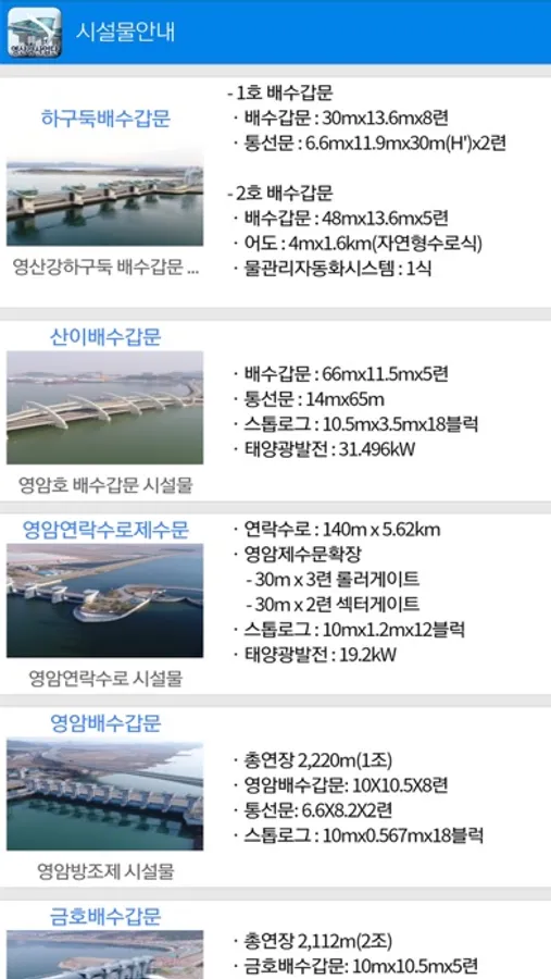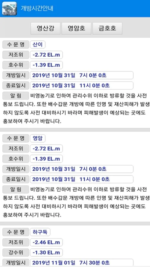 전남지역 영산강 수문의 위치를 알리고 수문 개방시간 등을 알려줍니다.